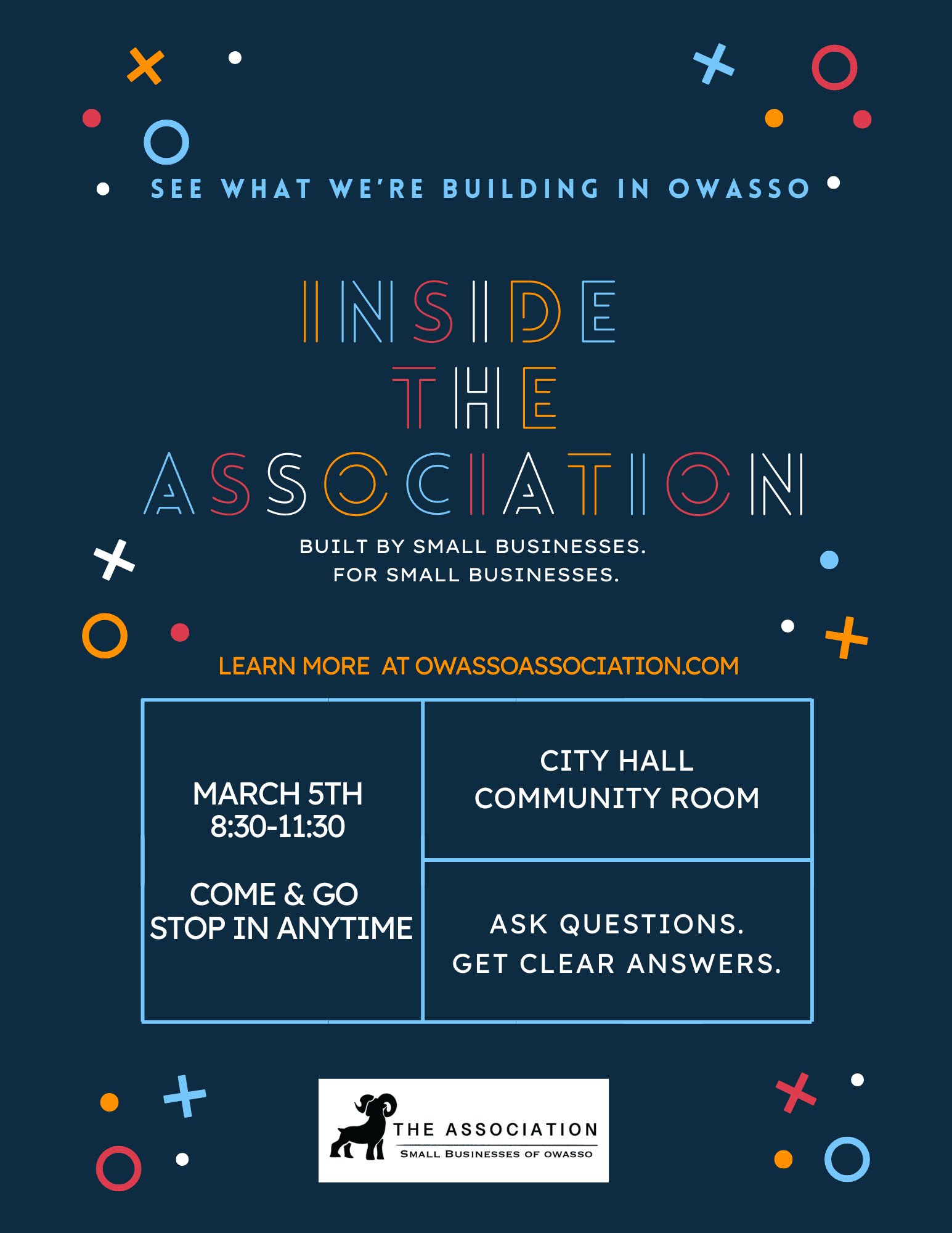Join us Saturday, February 7 from 10:00am–1:00pm at Owasso City Hall for our Inside the Association come-and-go event! Stop in for a casual opportunity to learn about membership and benefits, meet members of the board, and discover what the Association has to offer. Ask questions, connect with local business owners, and see if it’s a great fit for your business—no presentation and no pressure.