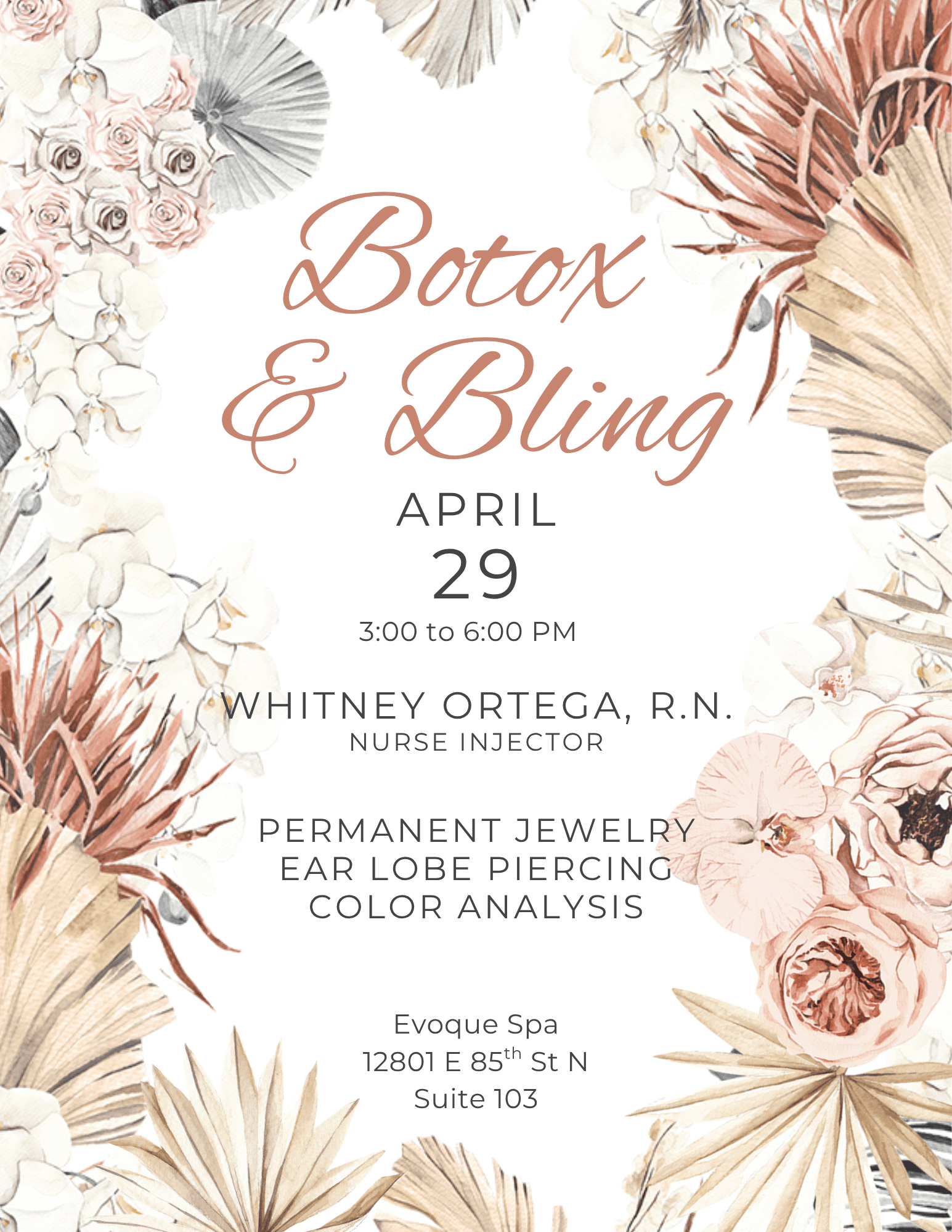 Join us for some Botox & Bling. Whitney Ortega, RN will be offering tox. See flyer in discussion section below for her pricing and reward specials. Text Whitney for tox appointments at 918-261-4108. Text Lainie for seasonal color analysis and ear lobe piercing appointments at 918-376-7241. Walk ins welcome for Evermore Permanent Jewelry.